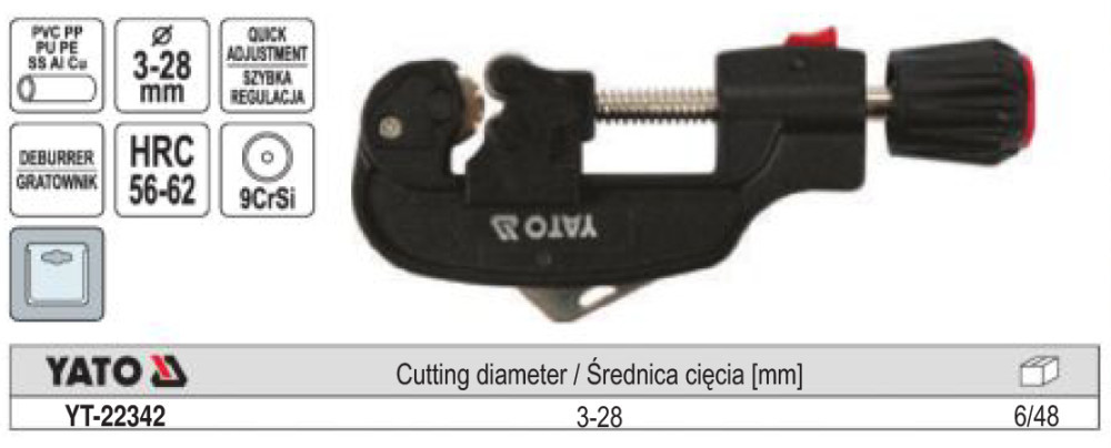 YATO YT-22342 Csővágó görgős 3-28 mm (réz, alu, inox, műanyag)
