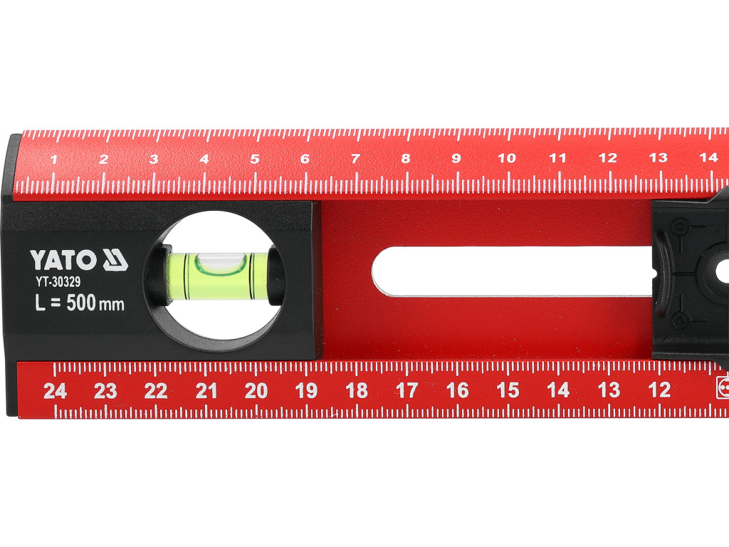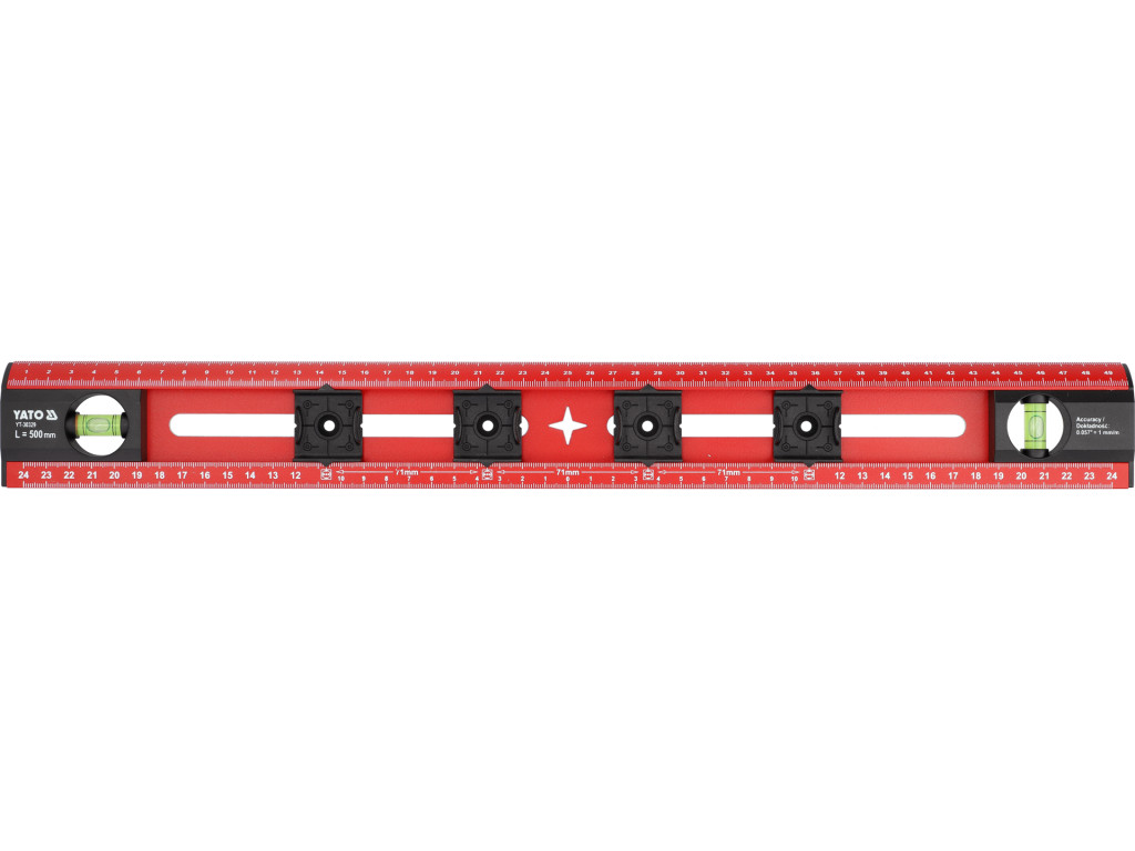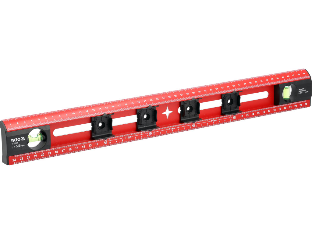 YATO YT-30329 Alumínium vízmértékvonalzó 500mm 2 libellával és 4 furatközép jelölő csuszkával