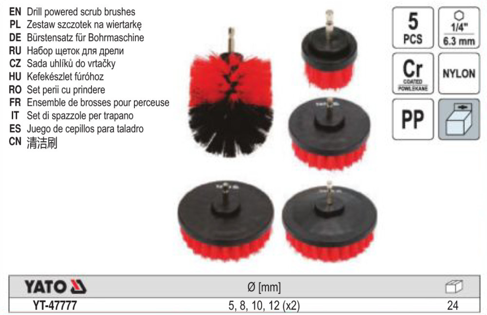 A Yato YT-47777 cikkszámú készlet egy öt darabos drótkefe készlet, amely hexagonális szárral rendelkezik. A készlet elemei:
